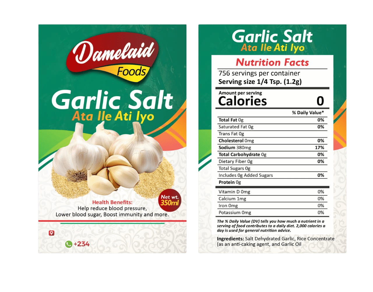 With Damelaid Garlic Salt, you no longer have to choose between health and flavor. Our garlic salt delivers rich, savory flavor with lower sodium than regular salt, helping keep your heart healthy, your meals delicious, and your family protected.
